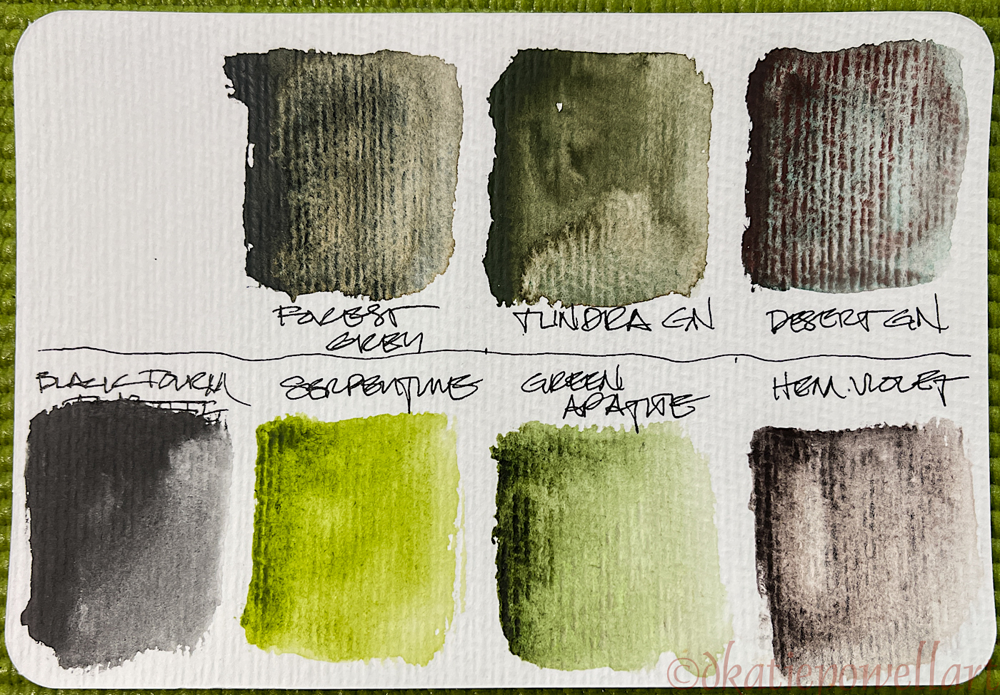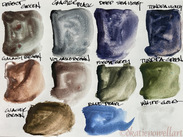 I took a page and slopped a on good amount of paint to see how they worked on the smooth paper in a Hahnemühle Nostalgie Sketchbook, which is my go-to everyday sketchbook. More disappointment, though the Desert Green (top left) was interesting. Tundra Violet (top right) had a little bit of possibility, but really, “meh”! They granulated, but I had chosen colors which, as they said, were made