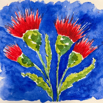 My next sketches were floral, of red Indian paintbrush (right) and pink eucalyptus blossoms, bottom of this page.