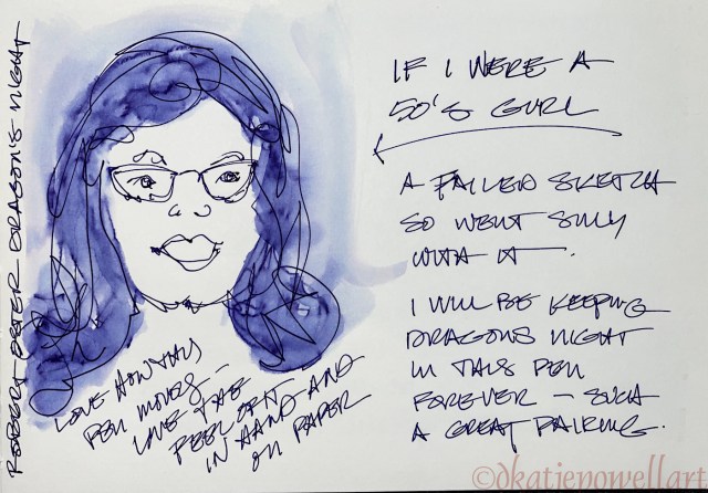 This ink is well-behaved, and like other Robert Oster inks, does not feather on any of the papers I normally use, even Post-its. I consider it a medium ink, neither wet nor dry, and it evaporates quickly with a wet nib. It has never smeared on me during a sketch. I see NO sheen, which is appropriate for a dark Dragon’s Night! The ink separates into beautiful blues when hit with water, right. When hit with water it moves easily with no resistance or ghosting. It is not water resistant.