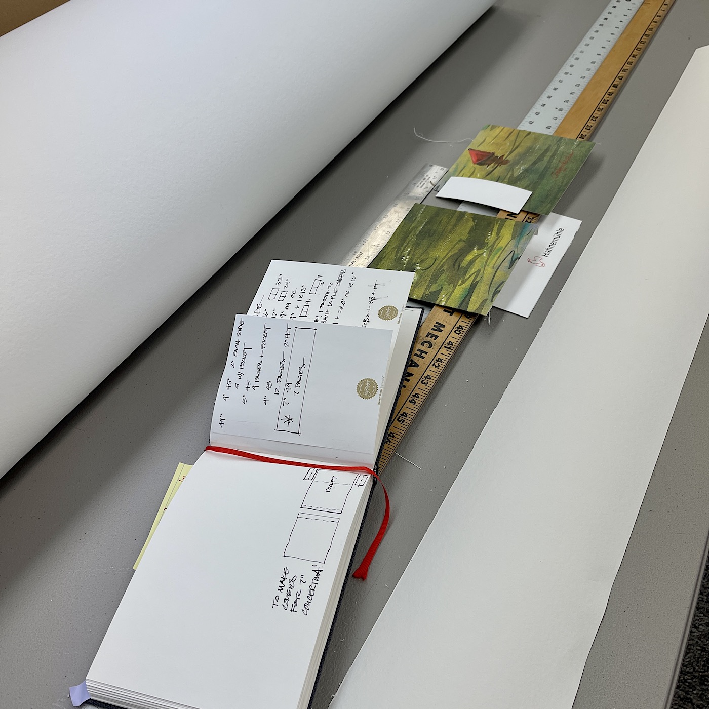 I bought a GINORMOUS roll of Hahnemühle bamboo paper, top and left. I had no idea how much there would be! I took notes about the process in a Hahnemühle Nostalgie Sketchbook, left, my favorite. Yup, I’m a groupie; I love their paper products.