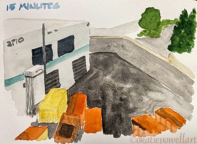 Day 11: No time, so with only 15 minutes (with drying time) I sketched the view out our window where we work on our computers in the studio.