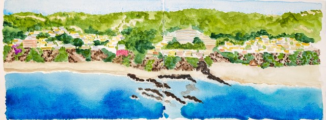 Day 10: Creating this look back at the place I grew up hurt my heart. This is a direct watercolor of home as it looked when I grew up there decades ago, South Laguna across from the hospital, above T Bay and Thousand Steps. This has changed, been completely obliterated by 6000-10000 sf McMansions on small lots where there were once quaint livable cottages (2000-3200sf) for normal people.