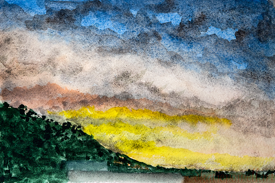 Day 20: Rainy moody skies looking at the West hills from our studio. Not night, but so dark the lights came on. This is what Direct watercolor should be, fast and wet and in the moment. Thought the colors might be interesting to you all. Happy with this one!