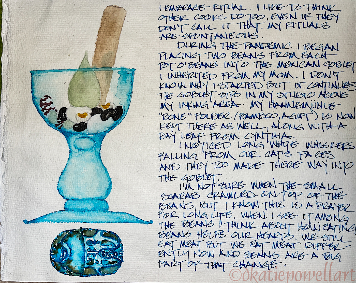 During the pandemic I began placing two beans from each pot o’beans into a blue Mexican goblet, left to me by my Mom, shown left and below. The goblet sits above my desk. My Hahnemühle “bone” folder (bamboo, a gift) is kept there as well, along with a bay leaf from Cynthia (a gift and of course, bay goes into many bean recipes.).