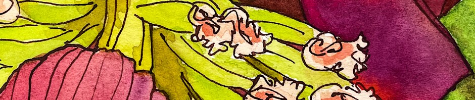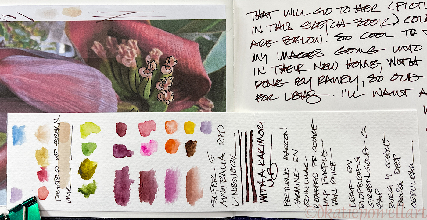 I used my new Kakimori dip pen for the line work, above, and Super5 Australia ink. I love the Super5 inks as they are “off colors” meaning not a clear brown or ultramarine blue or perfect red. I find them more interesting to use in sketches. The Australia ink reminds me of the purple-reds in the Australian landscape.