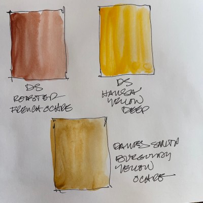 When I first started using the Daniel Smith Roasted French Ochre and Burgundy Yellow Ochre I wasn’t sure that they were strong enough colors for my palette… but then the more I used them the more I loved them. I must buy second tubes because these may not be around forever.
