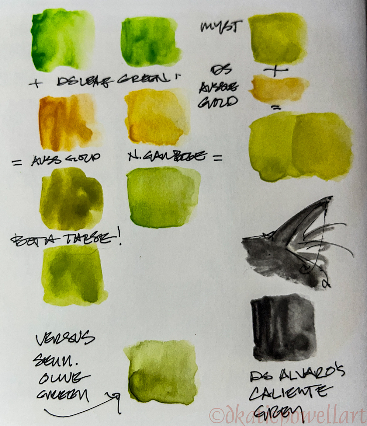 Platinum Carbon Pen with Platinum Carbon ink waterproof cartridges, White Uniball Signo, Da Vinci, Sennelier, Holbein, DS Primatek watercolors, and Daniel Smith Watercolors.
