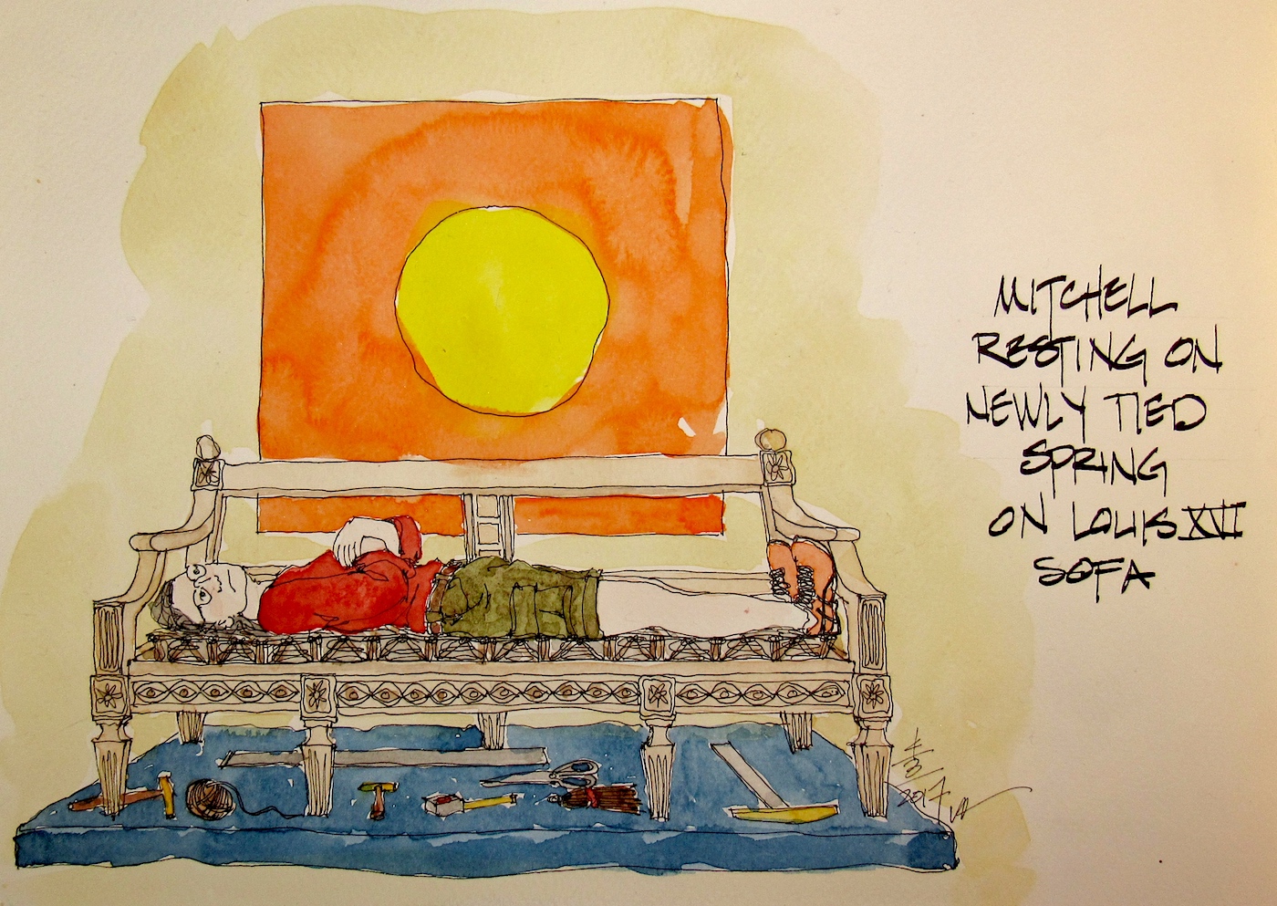 I work full-time and run a business with Mitchell restoring/conserving various types of objects. This keeps me busy, sometimes working 6-7 days a week if there is a deadline, so there is not much time to drop into painting a canvas, making handmade paper (my paper is shown in the painted piece left), or other types of my earlier creative endeavors.