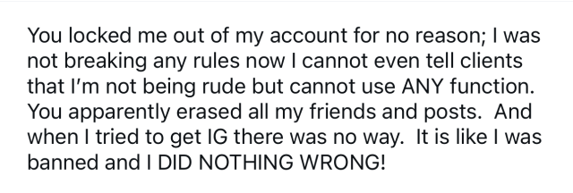 They accused me of posting just to gain followers (wow if I knew how to do that wouldn’t that be grand?) BTW, isn’t that part of what you want on IG? Isn’t punishing someone for trying to gain followers weird? Either way, it wasn’t what I did. A friend asked a question, I posted what you see in the IG spanking, right, and I had no recourse.