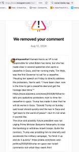 OMIGODDESS, yes and I didn’t know that was why because that is just so sick! Sometimes I am soooooo blonde (which I was before the grey). I was answering a friend’s questions below her post. The question was looking at both candidates, and how KH and TW both have talked Ceasefire and Rump has definitely said what he will do. I actually pulled quotes from Aljaz— and Slate, Yes yes YES, Orwellian to be sure, and so very very wrong. I wrote to my representatives about it (all dems). Mitchell and I both believe that social media should be regulated. From now on I will speak in code!