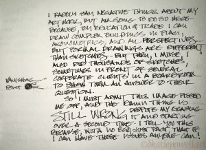 I don’t know what came over me. Instead of simply sketching my building visually, I went back in time and used a vanishing point. The point was placed across on the other page, above left, lines were drawn — something I did a thousand times as an architect. Good goddess, what a mess. It would have been so much easier, faster, with a better result if I had just eyeballed it.