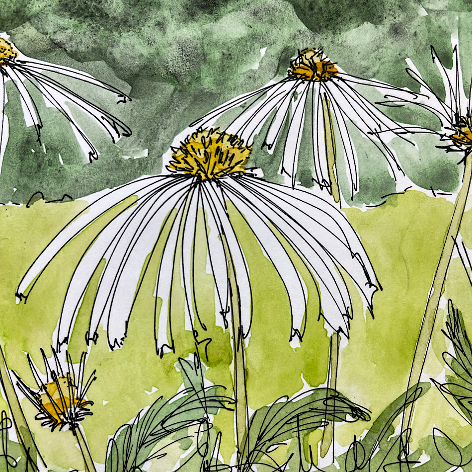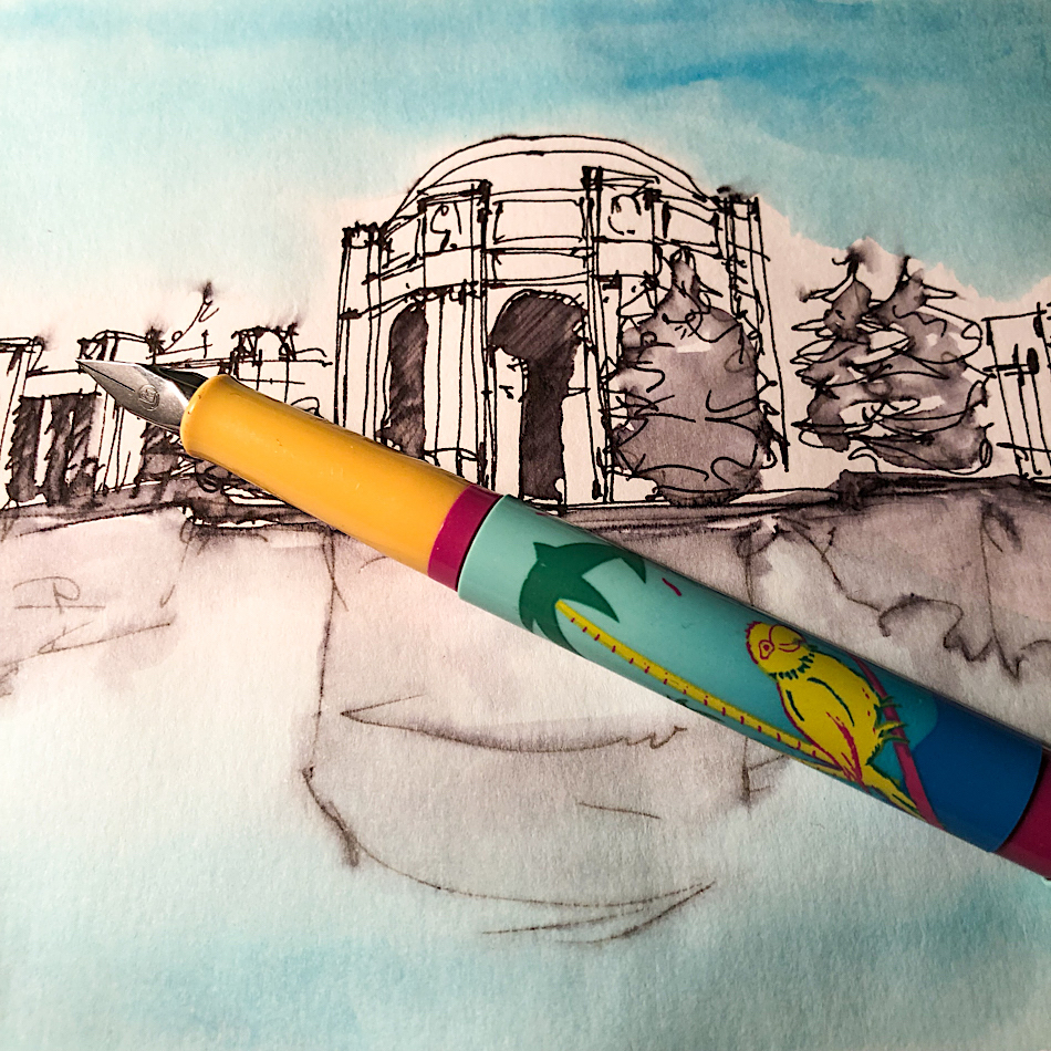 I continue to forget ahead of time to choose the right paper, very important in watercolor. I start an image in a smooth-textured sketchbook and am sorry when I decide the image is going to need washes of color, which are better on thicker textured paper. I am lazy about switching out to a watercolor sketchbook or pad.