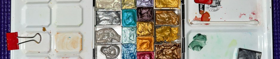 The colors above in the small half pans were some sparkling paints I bought from a small paint maker in England. I was disappointed in the paints (why I won’t mention her name) as they did not have good depth of color. The large pans are colors from makers I love. I have them in tubes, and will probably never have to buy them again because I rarely use them, but they are beautiful iridescent paints color and sparkling metallic paints.