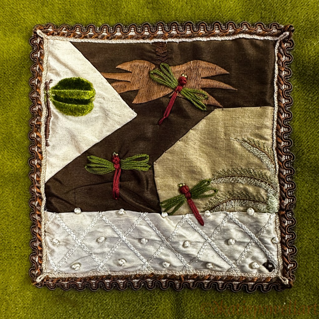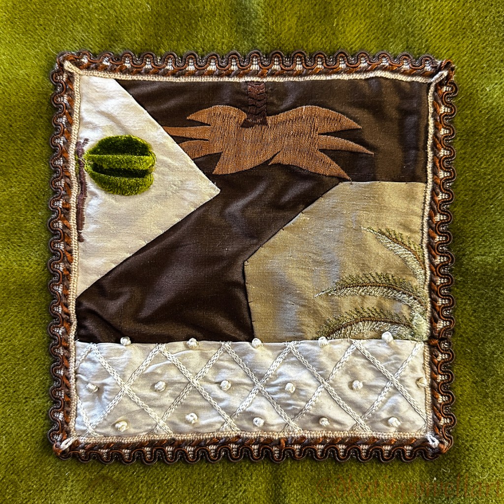 Above, the palm scraps. These fabrics all had a palm or butterfly pattern on them, except for the strip of cream on the bottom. It is a sort of mini-quilt, with embroidery.