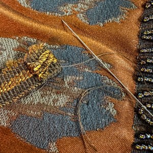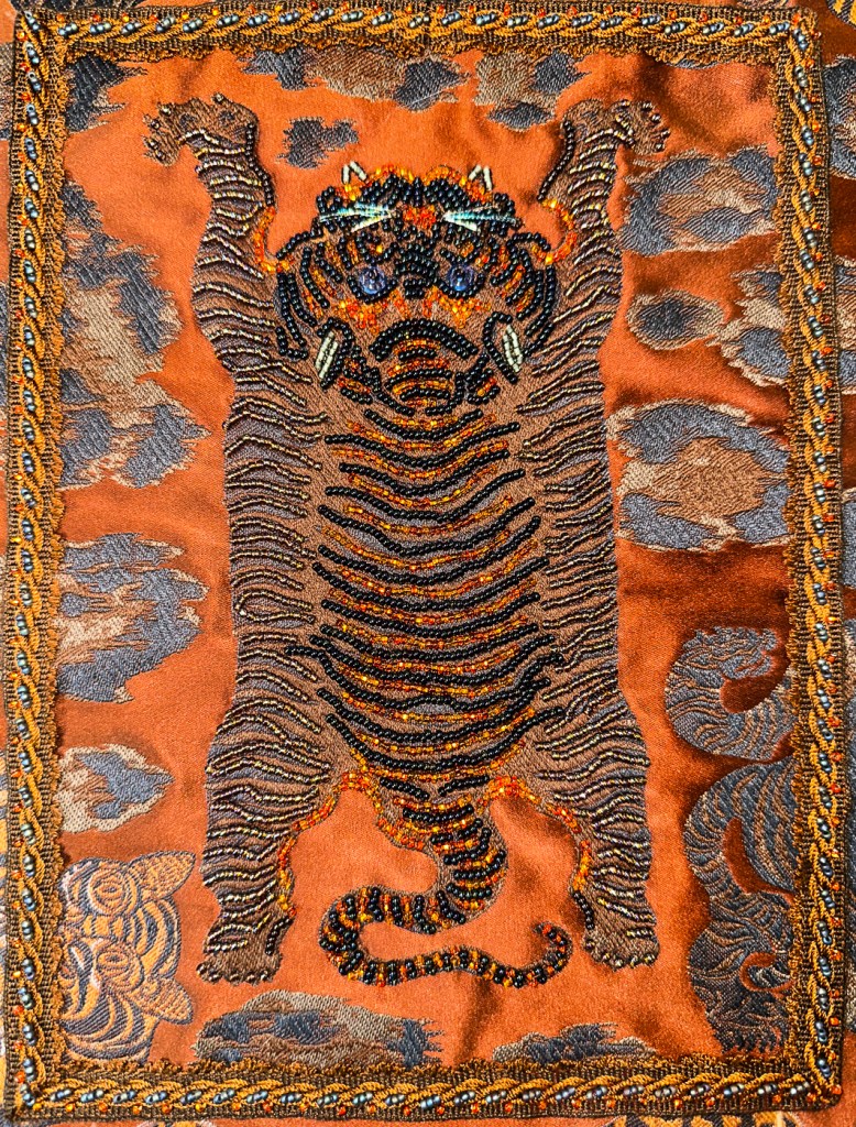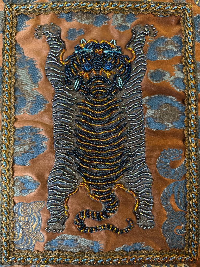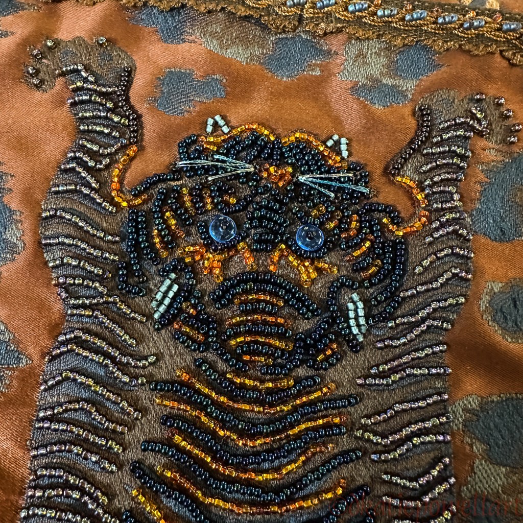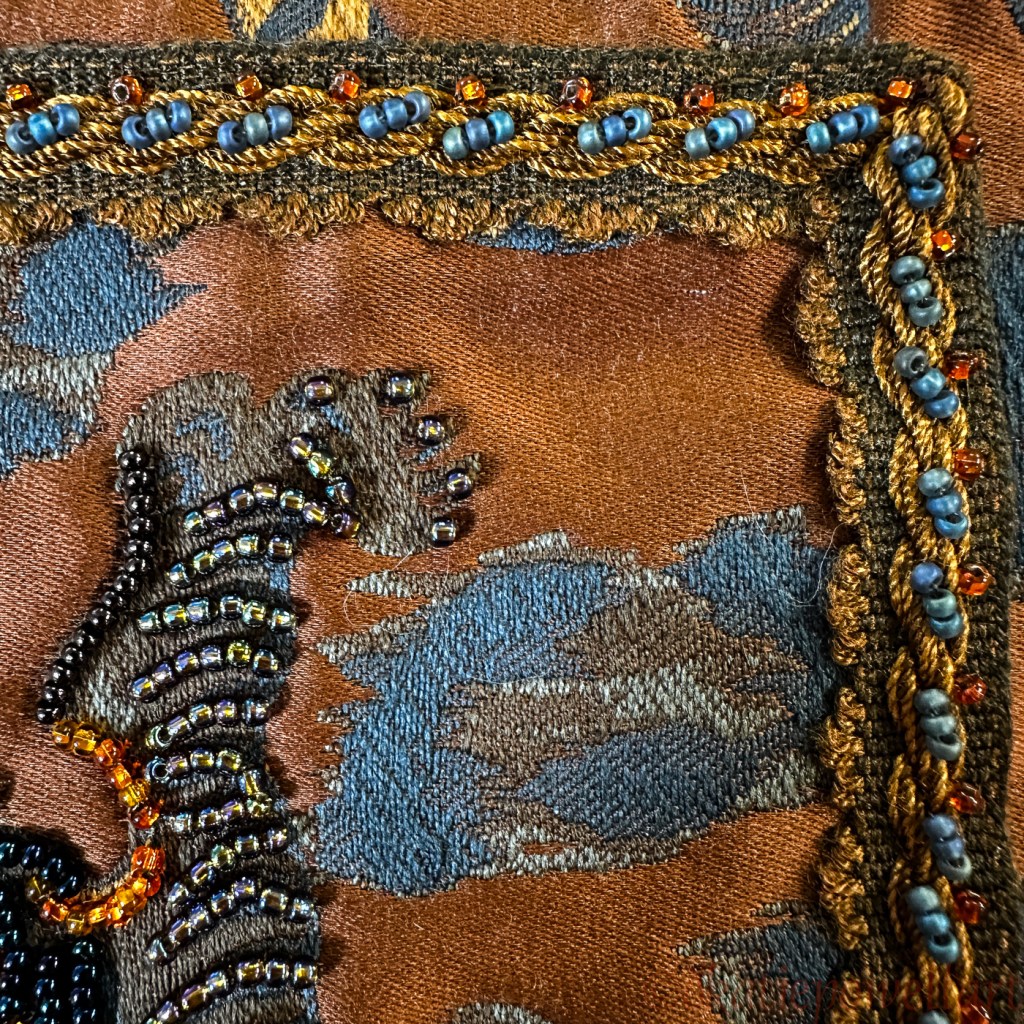 Beading is also meditation, one bead at a time, in and out with the needle. Very occasionally I was able to string 3-4 beads at a time, such as I did in the Tiger stripes or the beaded edges.