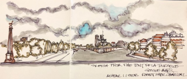 Over the dried ink wash I moved across the horizon line, adding lines for the various windmills and trees and such. I used two colors, the Robert Oster Midnight Sapphire, and then to warm the banks and wooden structures, Robert Oster Aussie Brown ink.