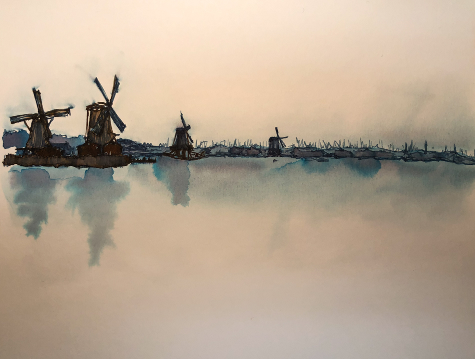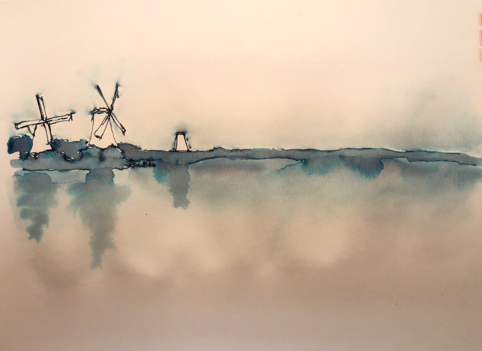 windmills in a foggy morning. I started with a horizon line… then before I got too far in my sketch I pulled ink down for the water, and up for the sky (wet area above shows the distance of the pull.)