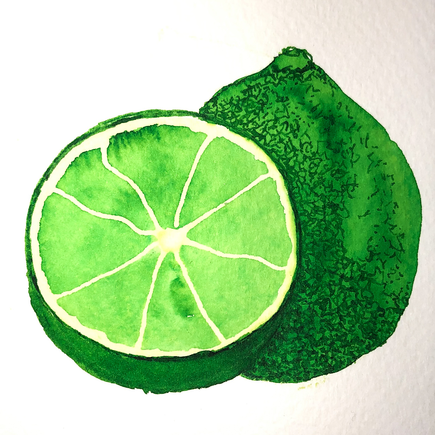 In #2 I added Fineline Masking Fluid to save the pale areas of the cut lime.