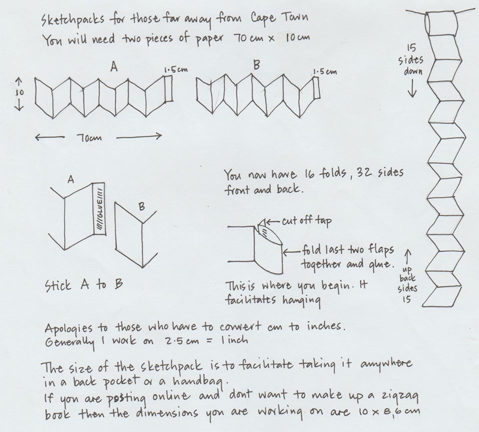 The project began in 2011 to get folks to draw daily. The sketchpack is a small zigzag journal with two usable sides, allowing one to sketch on both sides of 15 ‘pages’ to complete the month of August. There was much enthusiasm and the project is now repeated yearly in August, with a Facebook page for us to share as we go along. (The page is closed for viewing but you can join to play along!) There is an Exhibition held in October at the Artsauce Studio in Observatory, Cape Town, South Africa of mostly local Sketchpacks!